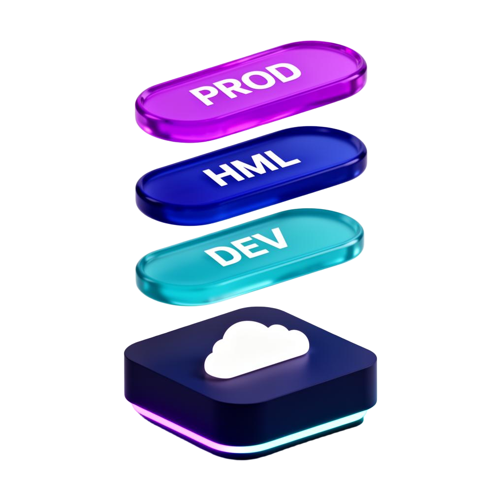 DEV, HML e PROD isolados, com promoção controlada.